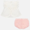 Pantalón short tipo braguita exclusivos de nuestra colección para bebé niña recién nacida. Goma elástica en la cintura para un mejor ajuste. Mezcla de tejidos combinados para lograr un diseño único y diferente.