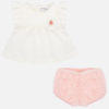 Conjunto de dos piezas para bebé niña recién nacida compuesto por un blusón con short a juego.