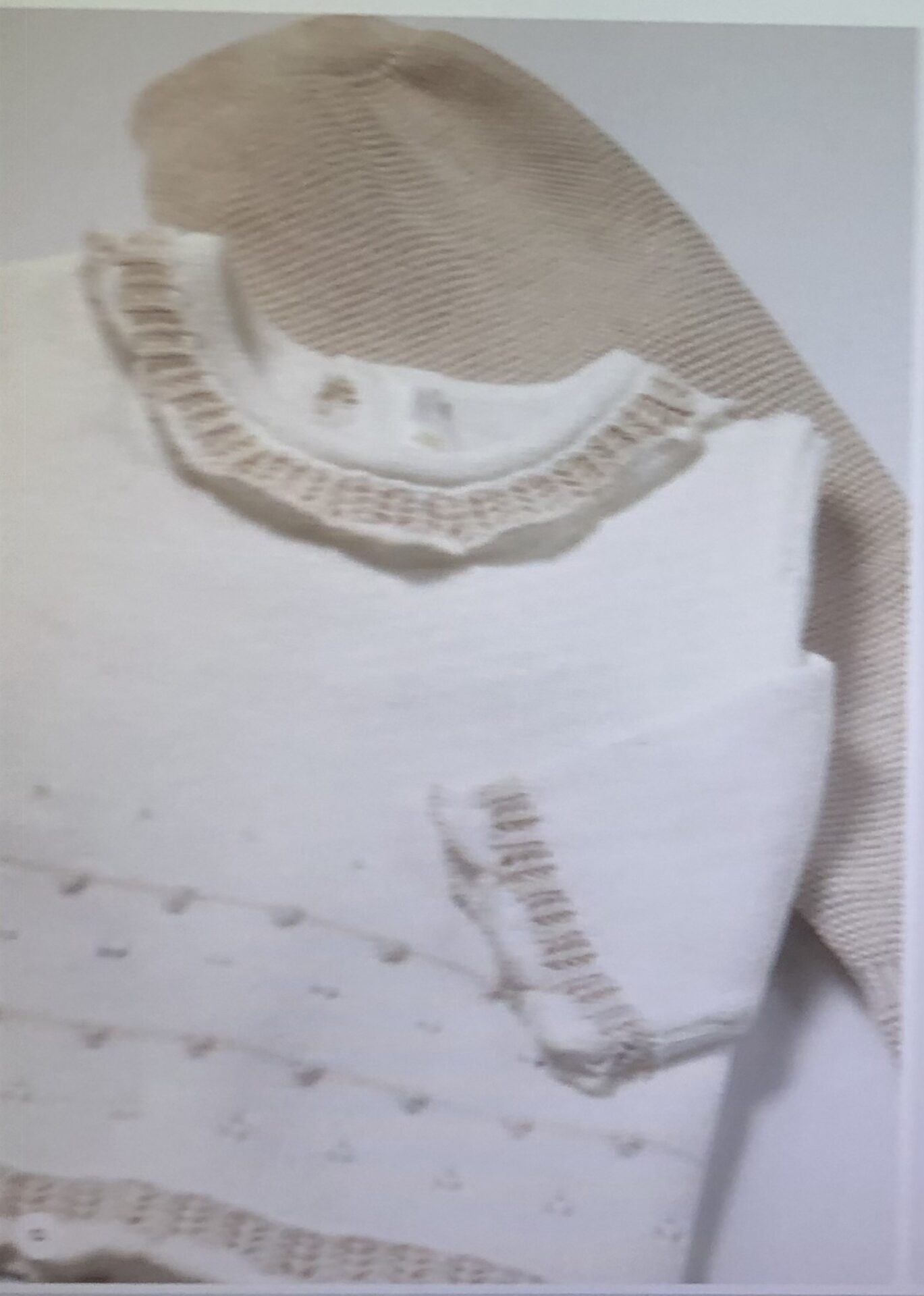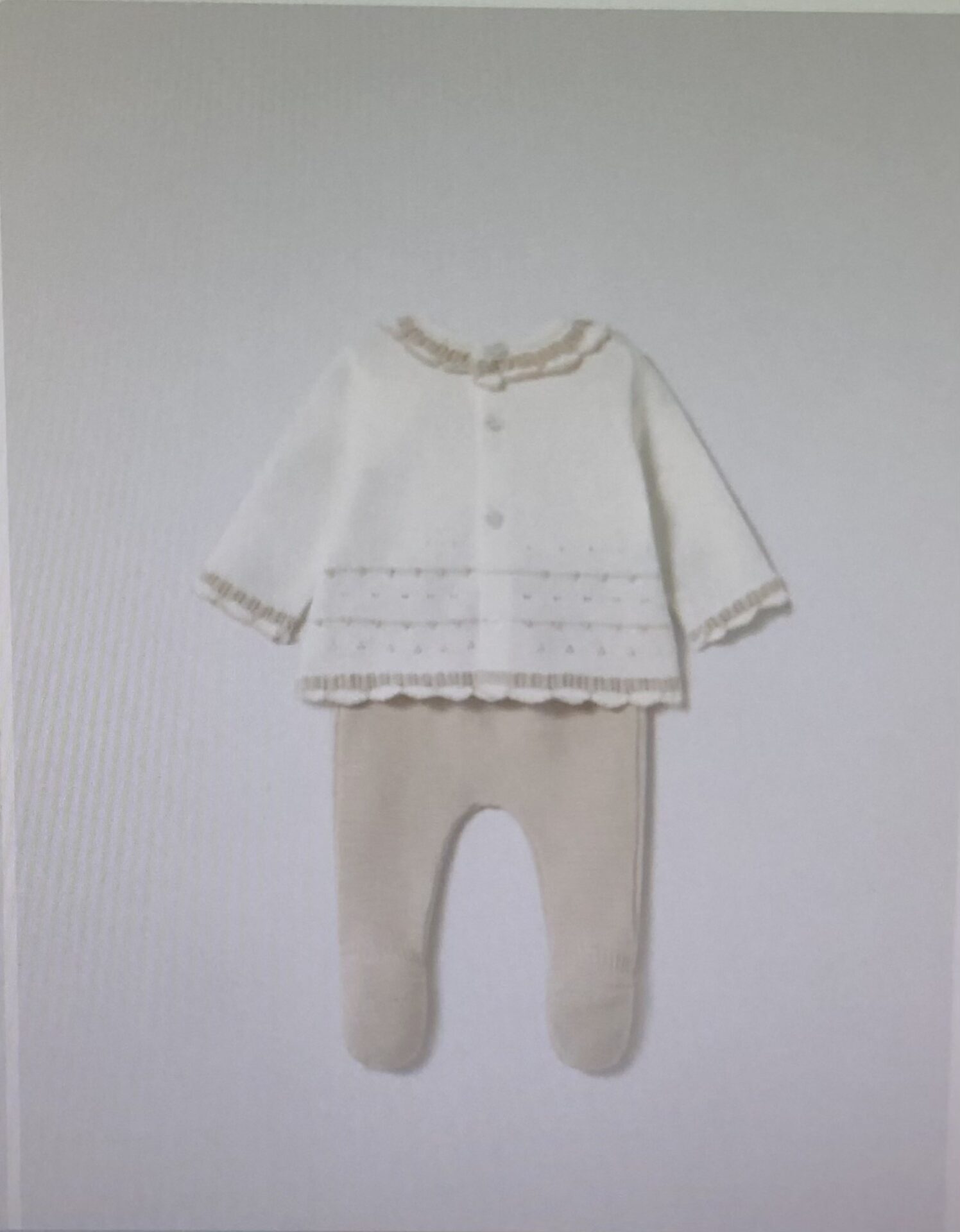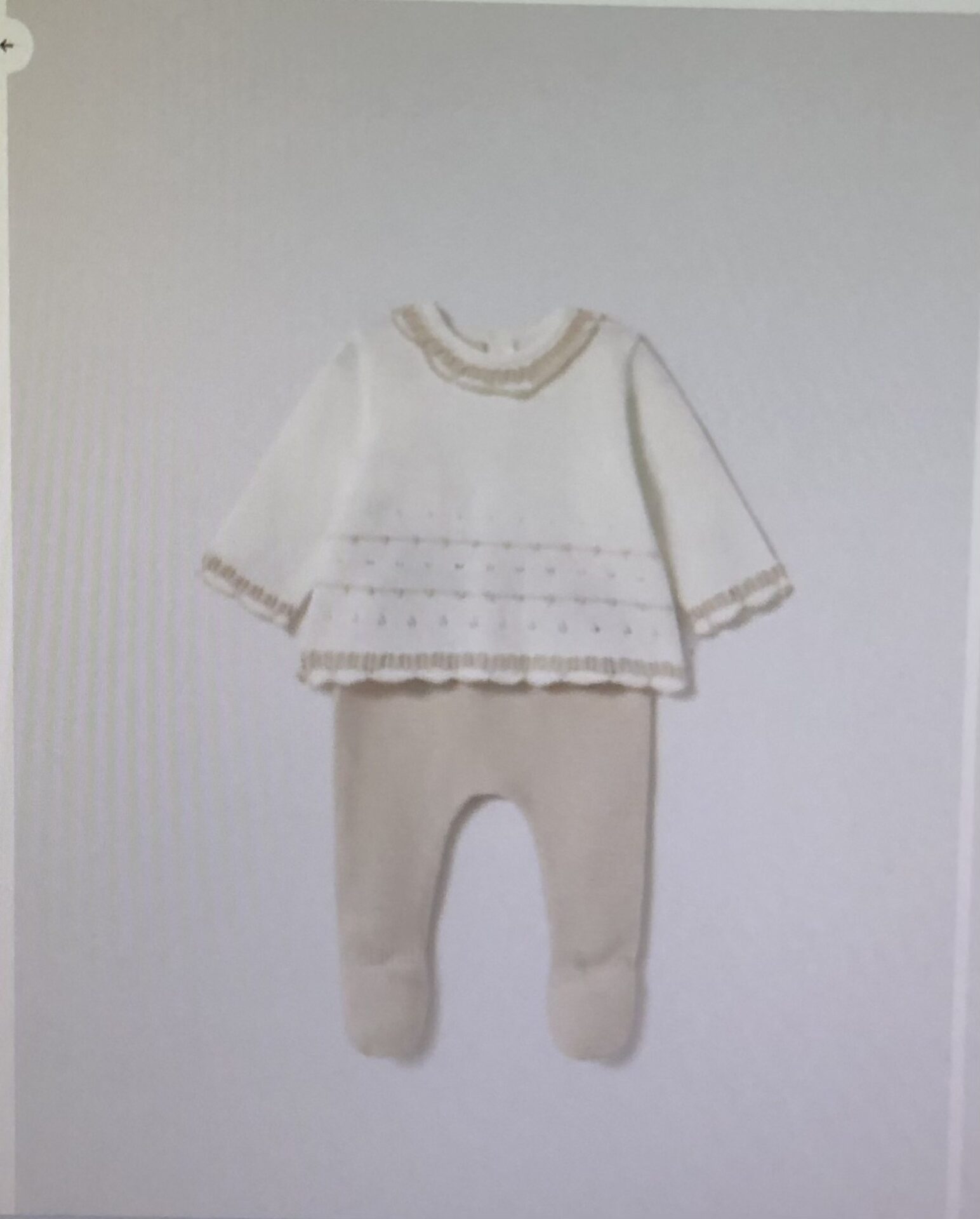 Conjunto tricot de dos piezas para recién nacido compuesto por jersey y polaina a juego.