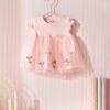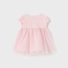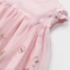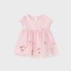Vestido de manga corta para recién nacido. Cierre con botones a presión en la parte posterior para facilitar la puesta de la prenda. Mezcla de tejidos combinados para lograr un diseño único y diferente. Elementos de adorno: bordados.