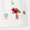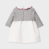 Vestido de manga larga en tejido a contraste para recién nacida niña. Cuello redondo con volante. Diseño simulado con rebeca en superposición. Cierre con cremallera trasera invisible. Suave tejido de algodón elástico. Elementos de adorno: bordados.