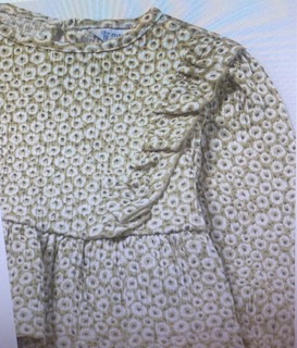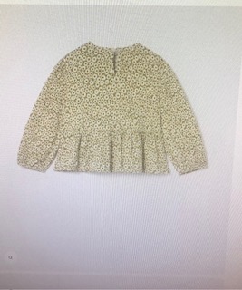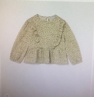 Blusa de manga larga para bebé. Pequeña abertura en la espalda con cierre de botón para facilitar la puesta de la prenda. Tejido de bambula de gran fluidez. Modelo con rizo y volantes. Diseño estampado.