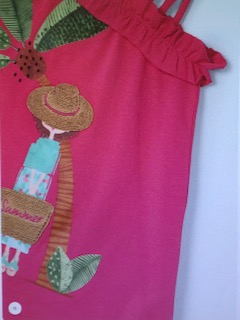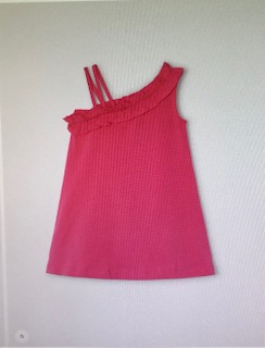 Vestido de tirantes para niña. Cuello asimétrico. Suave tejido de algodón elástico. Modelo con diseño de volantes. Elementos de adorno: apliques decorativos, serigrafía (print). Estampado tropical.