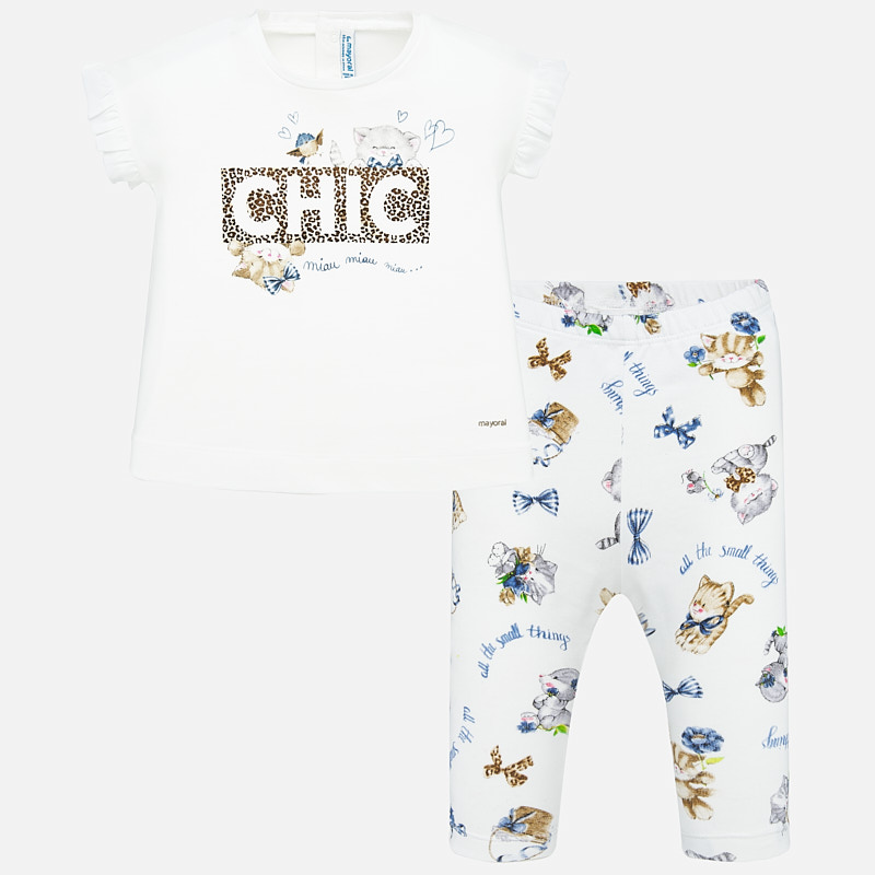 Conjunto de dos piezas para niña compuesto por una camiseta y un pantalón tipo legging combinado.