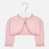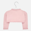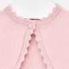 Rebeca de manga larga para bebé niña con detalles al tono. Cuello redondo. Diseño corto de tipo bolero. Cierre con un único botón en el escote delantero. Cómodo tejido de punto. Diseño con terminaciones en ondas.