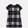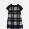 Vestido de manga corta para chica. Cuello redondo. Mezcla de tejidos combinados para lograr un diseño único y diferente. Modelo con forro interior. Diseño con detalles en el bajo al tono. Elementos de adorno: tachuelas. Motivo de cuadros.