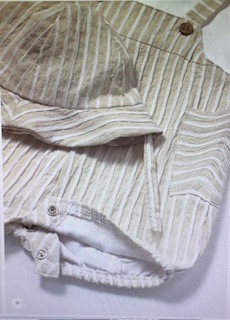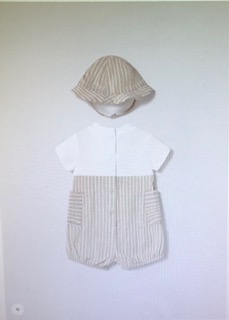 Pelele de manga corta para recién nacido. Diseño con peto simulado en superposición. Cierre con botones en la espalda para facilitar la puesta de la prenda. Cierre con botones en la entrepierna. Motivo de rayas.
