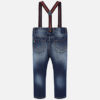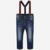Pantalón largo con tirantes para niño holgado en la parte superior, con ajuste normal en el muslo y estrecho en la pernera. Son de tiro amplio y normalmente caído, ideales para un look casual y moderno. Cierre con cremallera y botón. Goma elástica regulable en la cintura para ajustar el talle. Moderno tejido denim con efecto lavado y acabado desgastado. Diseño con múltiples bolsillos. Por motivos de seguridad, las tallas pequeñas (2-5 años) no llevarán cremallera en la bragueta, sino que será simulada.